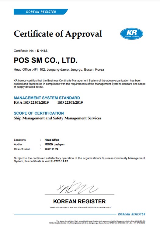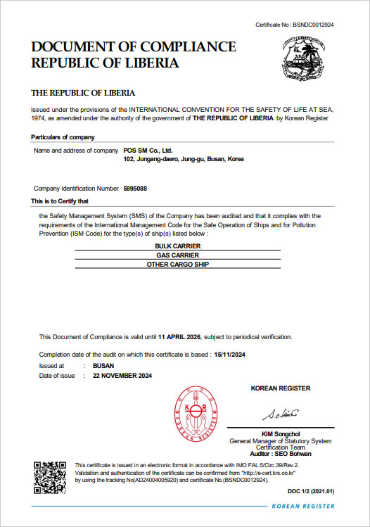 POS SM-DOC (LIBERIA)Certificate for the Cocument of Compliance (LIBERIA) Certification date : November.22,2024